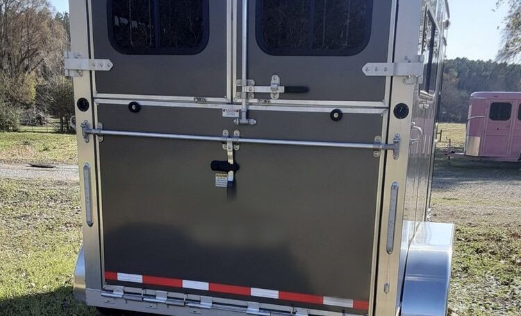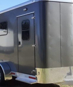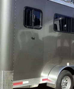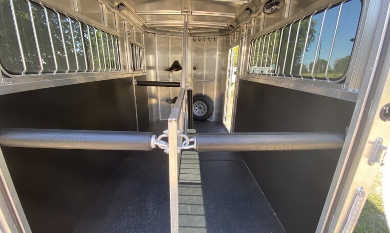 Get an all aluminum 2 ( Two ) horse trailer for sale for under $13,000! This is a brand new straight-load Stablemate, has saddle racks in the front but no dressing room wall. Trailer measures 12.6 x 7.6 x 6.9, 3500 lb axles, drop-down windows streetside, 32″ access door curbside, 2 saddle racks in front nose, 19 x 64 slider windows at hip area, rear ramp/dutch doors, dome lights, rumber lined walls, pressure treated wood floor with mats, fans.